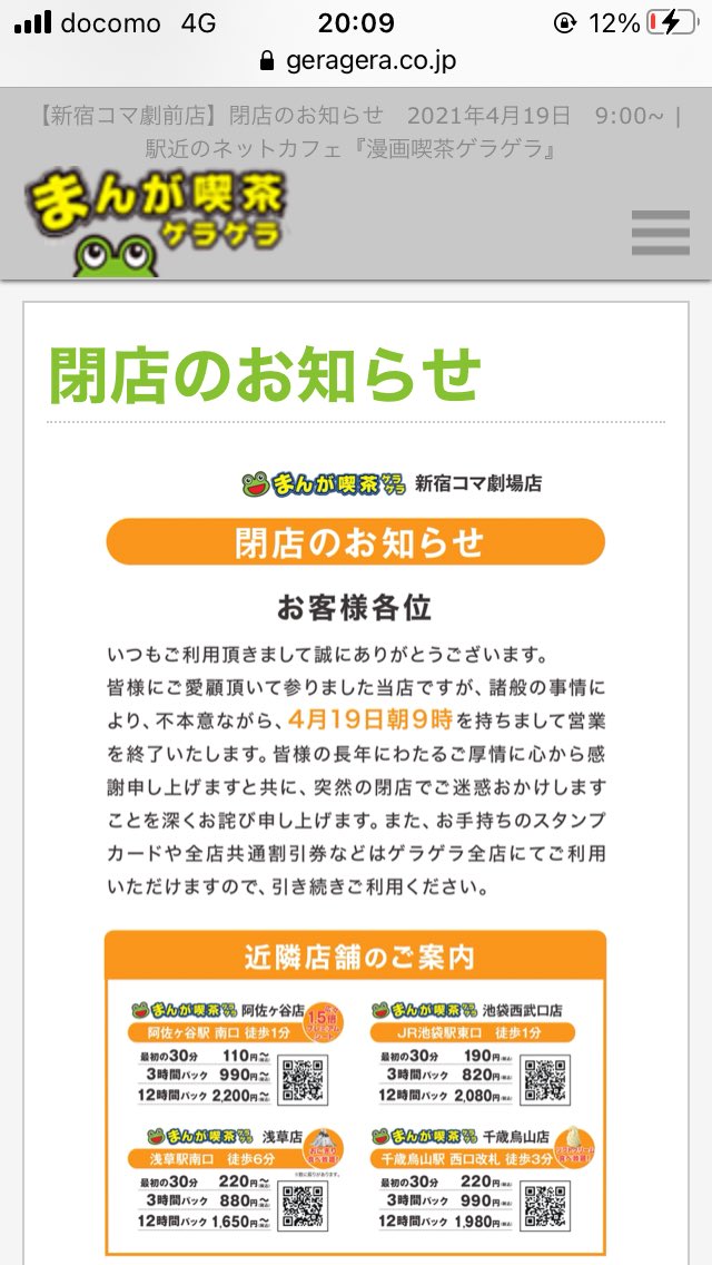 漫画 喫茶 ゲラゲラ 新宿- 新宿駅周辺の安くて・宿泊可能なネットカフェ・漫画喫茶まとめ! 更新日: 19年10月6日 この記事では、新宿駅から徒歩圏内のおすすめネットカフェ・漫画喫茶を紹介しています。浅草で地下2階の店って・・・ ずん田もち。@negixxzun 私の今の思いです。身バレ覚悟です。 長いですが、よければ目を通してもらえたら嬉しいです。